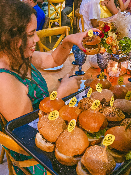 Incluímos entradas como dadinho de tapioca com geleia de pimenta, mini wrap de queijo com tomate, nachos com molhos entre outros. Acompanhamento como batata frita, cebola empanada, bolinha de queijo e outros. O famoso mini hambúrguer em diversas opções, entre elas o nosso vegano com hambúrguer do futuro, feito de plantas. sobremesas como milk shake e mini churros e ainda bebidas não alcoólicas. Enfim… Agradamos todos os gostos.